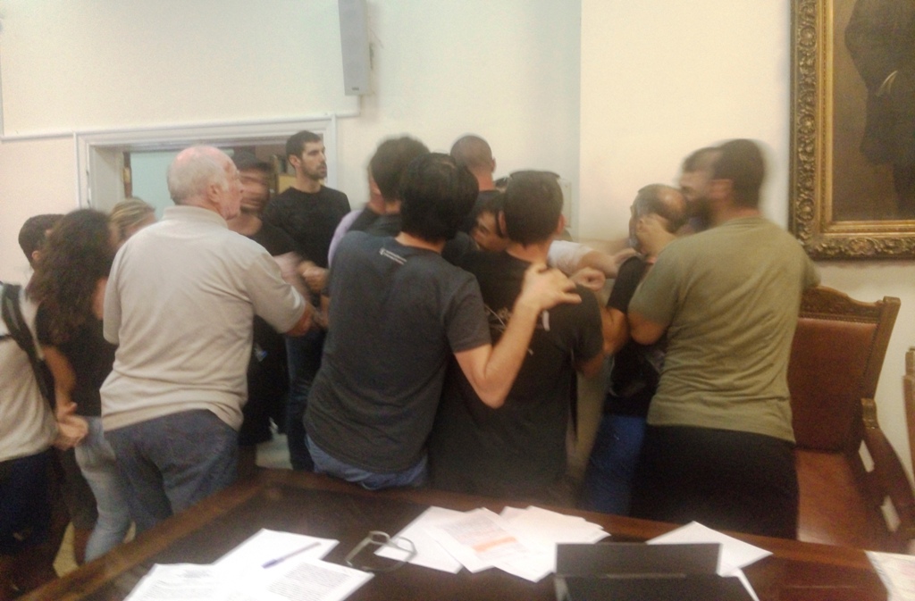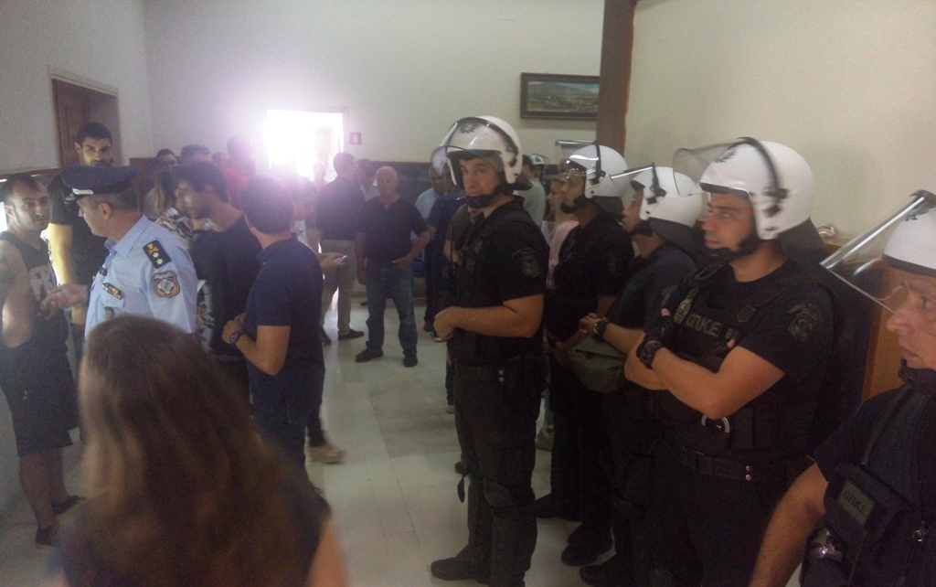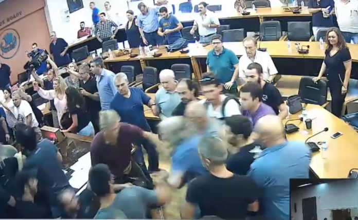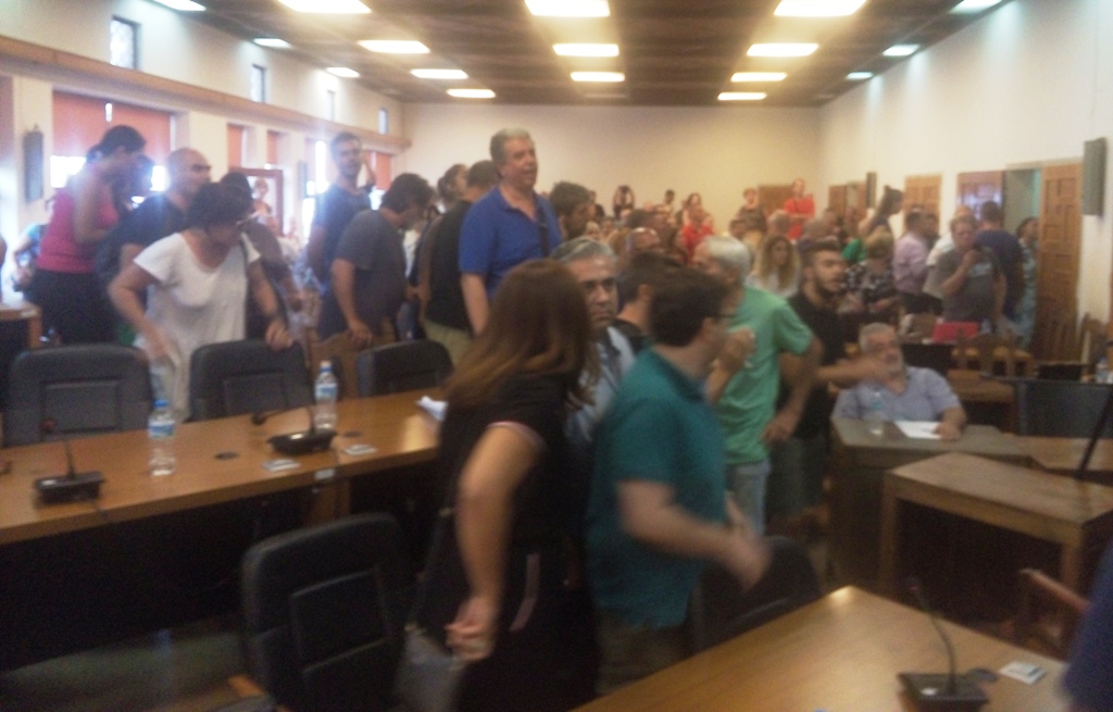 Την ίδια ώρα ωστόσο, άλλοι πολίτες που καταγγέλθηκαν ως “μπράβοι” και φέρονται να υπερασπίζονται την τακτική της δημοτικής αρχής, μπήκαν μπροστά τους και τους απώθησαν, με συνέπεια να αρχίσει καυγάς. Αποτέλεσμα ήταν να βγουν “σηκωτοί” από την αίθουσα οι χαρακτηριζόμενοι ως “μπράβοι” υπό το σύνθημα “έξω οι μπράβοι από το Δημαρχείο”. Στην αίθουσα του συμβουλίου εισήλθαν και δυνάμεις της Αστυνομίας που προσπάθησαν να απομακρύνουν τους εμπλεκόμενους πολίτες, ενώ η συνεδρίαση σταμάτησε.