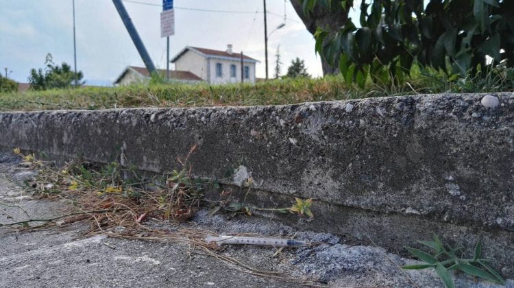 Χρησιμοποιημένες σύριγγες ηρωίνης που βρέθηκαν σκόρπιες στην πλατεία του ΟΣΕ, προκαλούν ανησυχία.